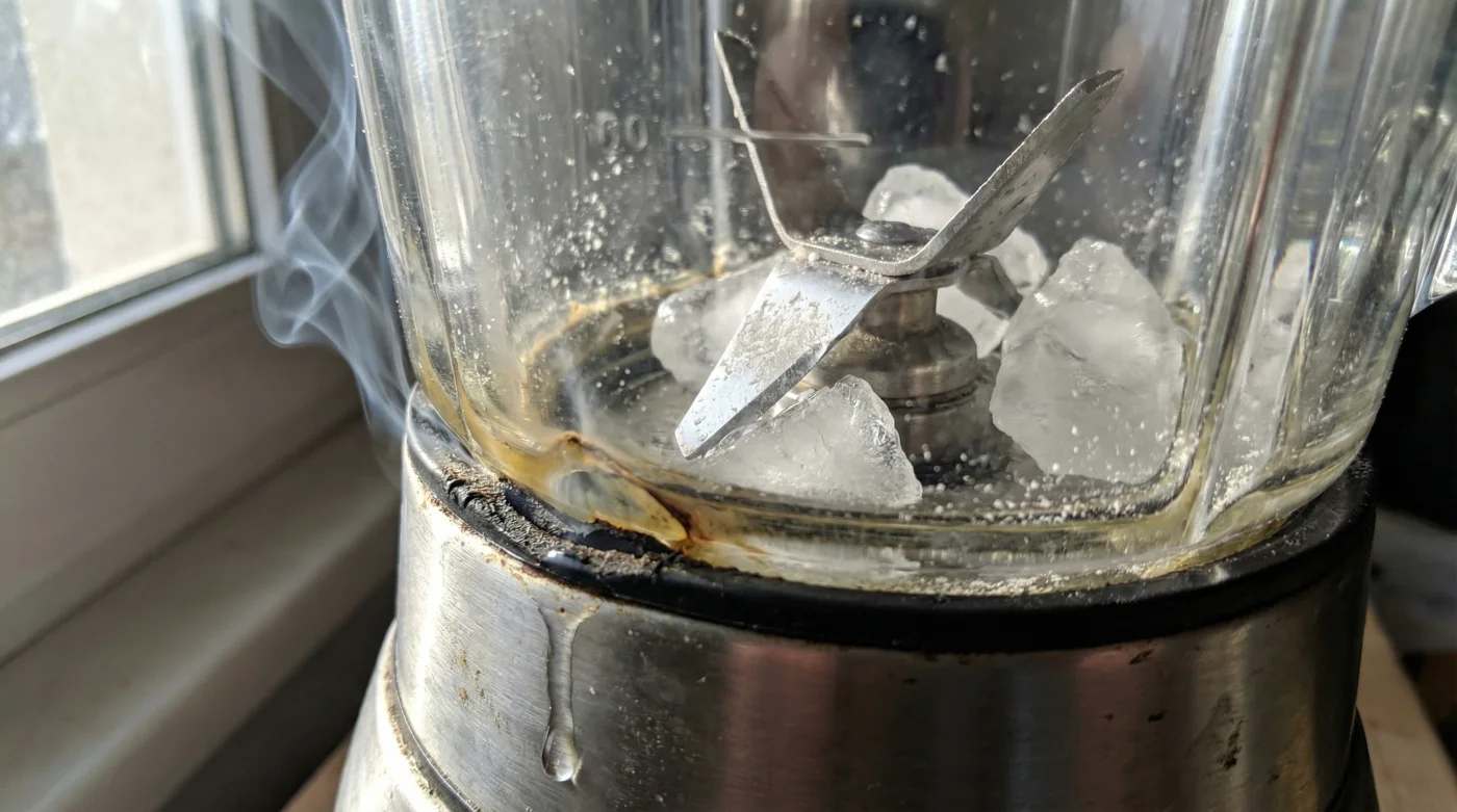 Sin agua, leche o jugo que actúe como lubricante y vehículo de transporte, el hielo atrapa las aspas inferiores sin piedad. El motor de tu Samurai sigue recibiendo corriente eléctrica desde el tomacorriente e intenta girar a miles de revoluciones por minuto. Al estar bloqueado físicamente, esa inmensa energía no se convierte en movimiento, sino en calor extremo que calcina la bobina del motor en cuestión de segundos.