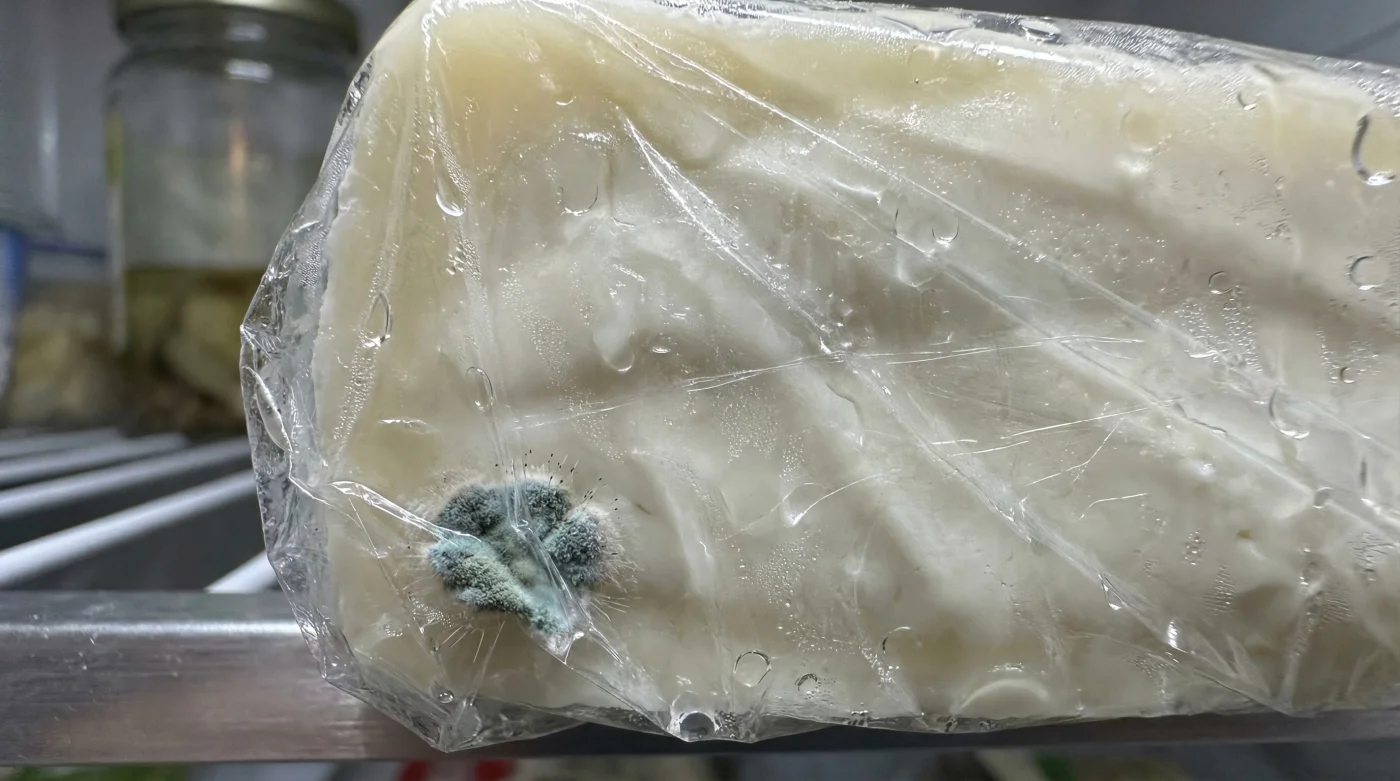 Pero al desenrollar esas infinitas capas de plástico transparente, notas algo extraño. La superficie, que debería ser blanca, porosa y mate, está brillante y peligrosamente resbaladiza. Las esquinas desprenden un olor ligeramente ácido que no corresponde a la leche fresca, y una mancha verde delata que el ciclo natural de tu comida se ha corrompido antes de tiempo.