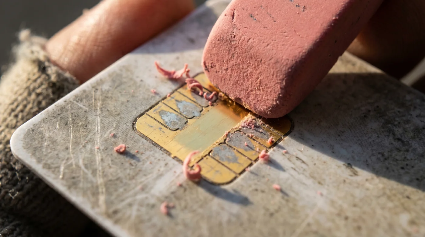 | Limpieza mecánica seca | Borrador de nata frotado sobre el relieve del chip. | Ahorras los 8.000 COP de reposición y proteges tu saldo atrapado al instante. |