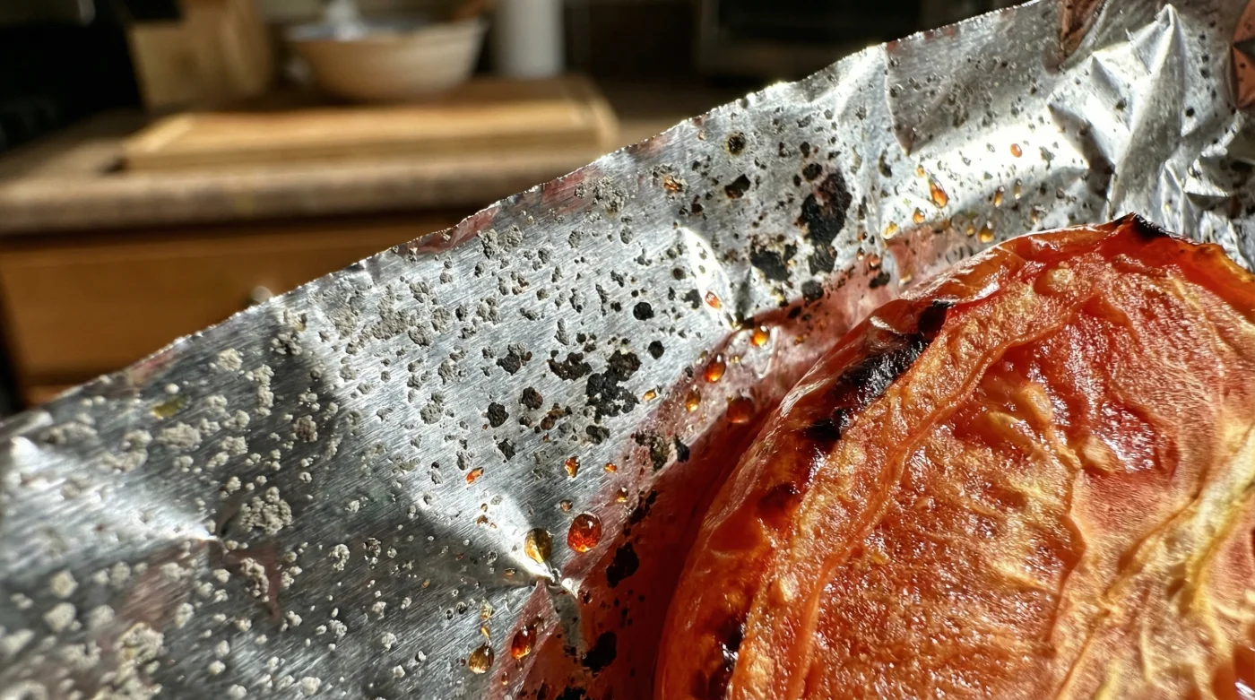 La cruda realidad es que la acidez actúa sin piedad contra esa barrera aparentemente sólida. El tomate, con su altísimo nivel de ácido cítrico y málico, genera un entorno hostil (un pH cercano a 4.3). Cuando lo envuelves directamente contra la cara más brillante y pulida, y le aplicas altas temperaturas, la superficie del material cede ante el estrés térmico. No funciona como un espejo impenetrable; bajo el calor del horno y el ácido de los jugos, el metal comienza a comportarse como una esponja inversa, transfiriendo silenciosamente iones de aluminio a tu comida y arruinando el perfil de sabor de raíz.