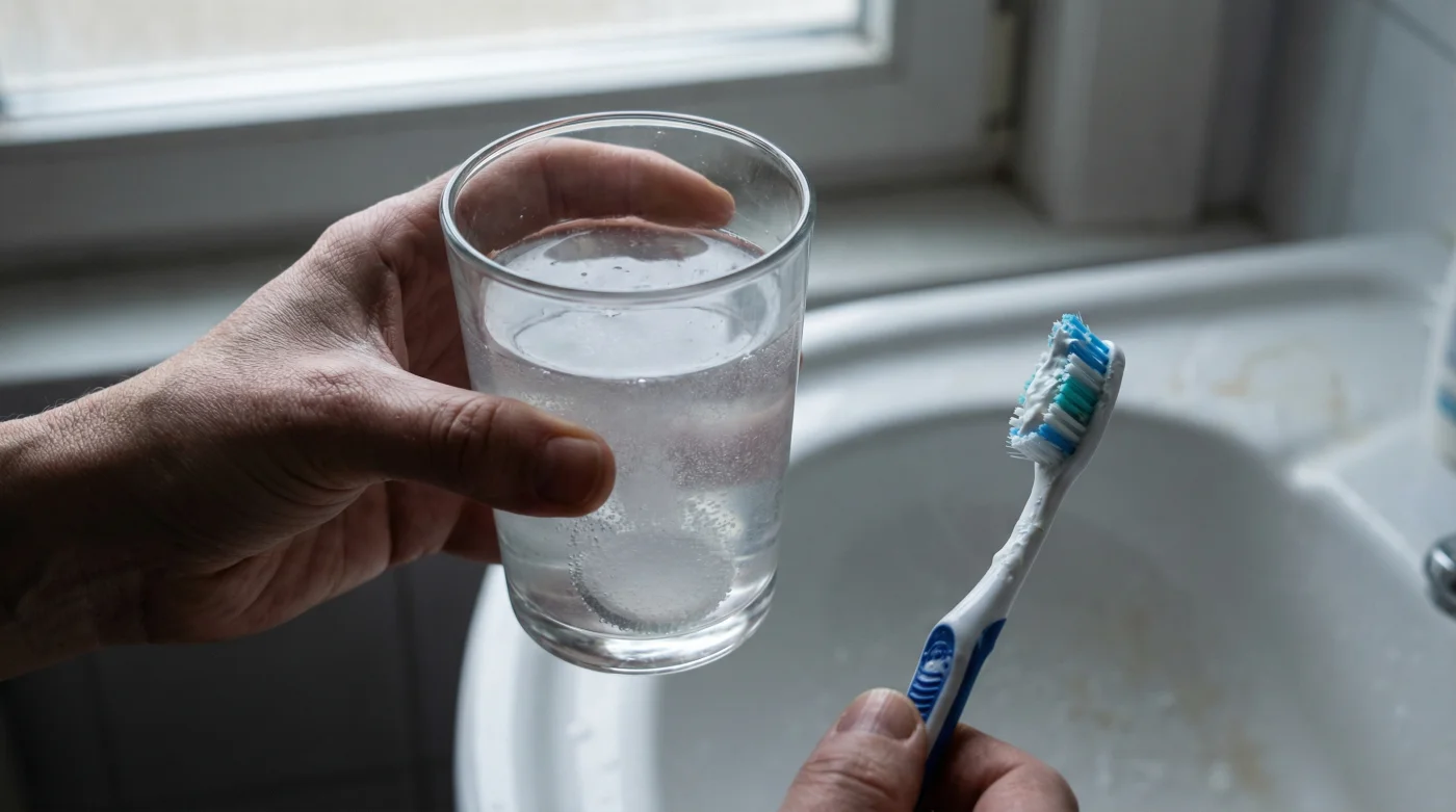 Cuando termines tu vaso burbujeante, camina hacia el lavamanos, pero aleja las manos del cepillo. En su lugar, abre la llave y toma un sorbo de agua pura a temperatura ambiente. Haz un buche vigoroso, moviendo el agua por todas las comisuras durante unos diez o quince segundos, y escúpelo. Este simple acto de enjuague mecánico barre los residuos de ácido sueltos y los polvos de la pastilla sin aplicar ninguna fricción agresiva.