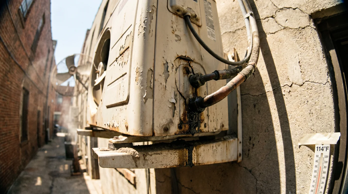 El compresor es el núcleo vital de tu sistema. Su único trabajo es tomar el calor acumulado en el interior de tu habitación y expulsarlo violentamente al exterior. Pero cuando la temperatura ambiente de la calle se dispara a 38 grados y el sol hornea la carcasa de metal hasta alcanzar los 60 grados, la física básica del intercambio térmico colapsa por completo.