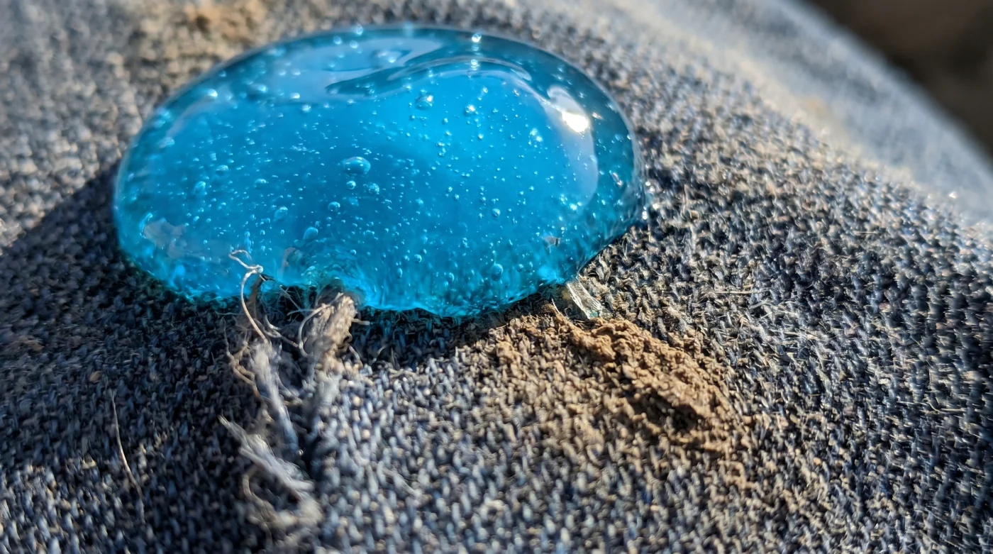- Usa la yema de tu dedo índice o un cepillo de cerdas extremadamente suaves para masajear circularmente el gel en la trama de la tela, asegurándote de que el tono azul penetre hasta el reverso.