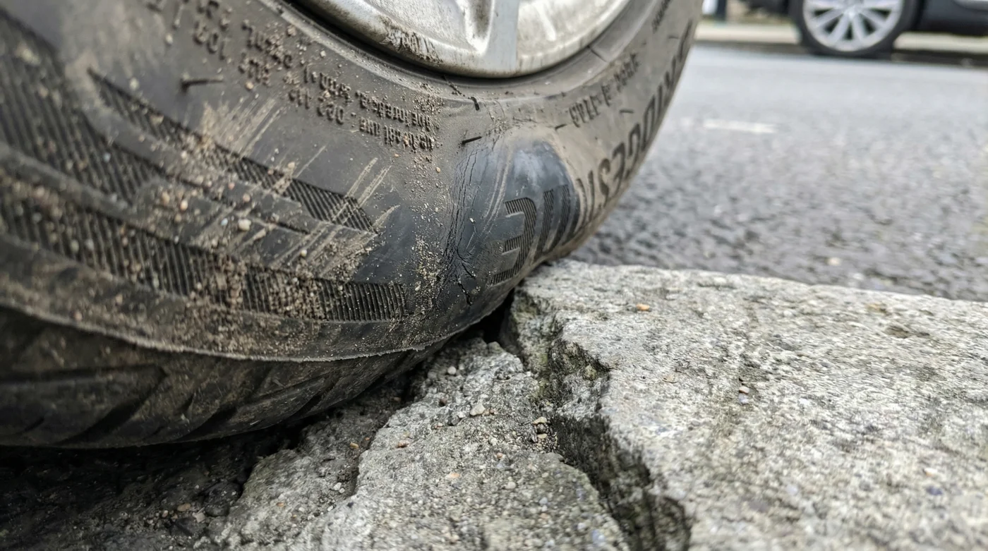 ¿Por qué es tan grave parquear sobre un andén si mi camioneta es alta? La altura general del vehículo no protege las ruedas; todo el peso sigue concentrándose de forma crítica en el punto exacto donde la goma se dobla contra la esquina rígida de concreto.