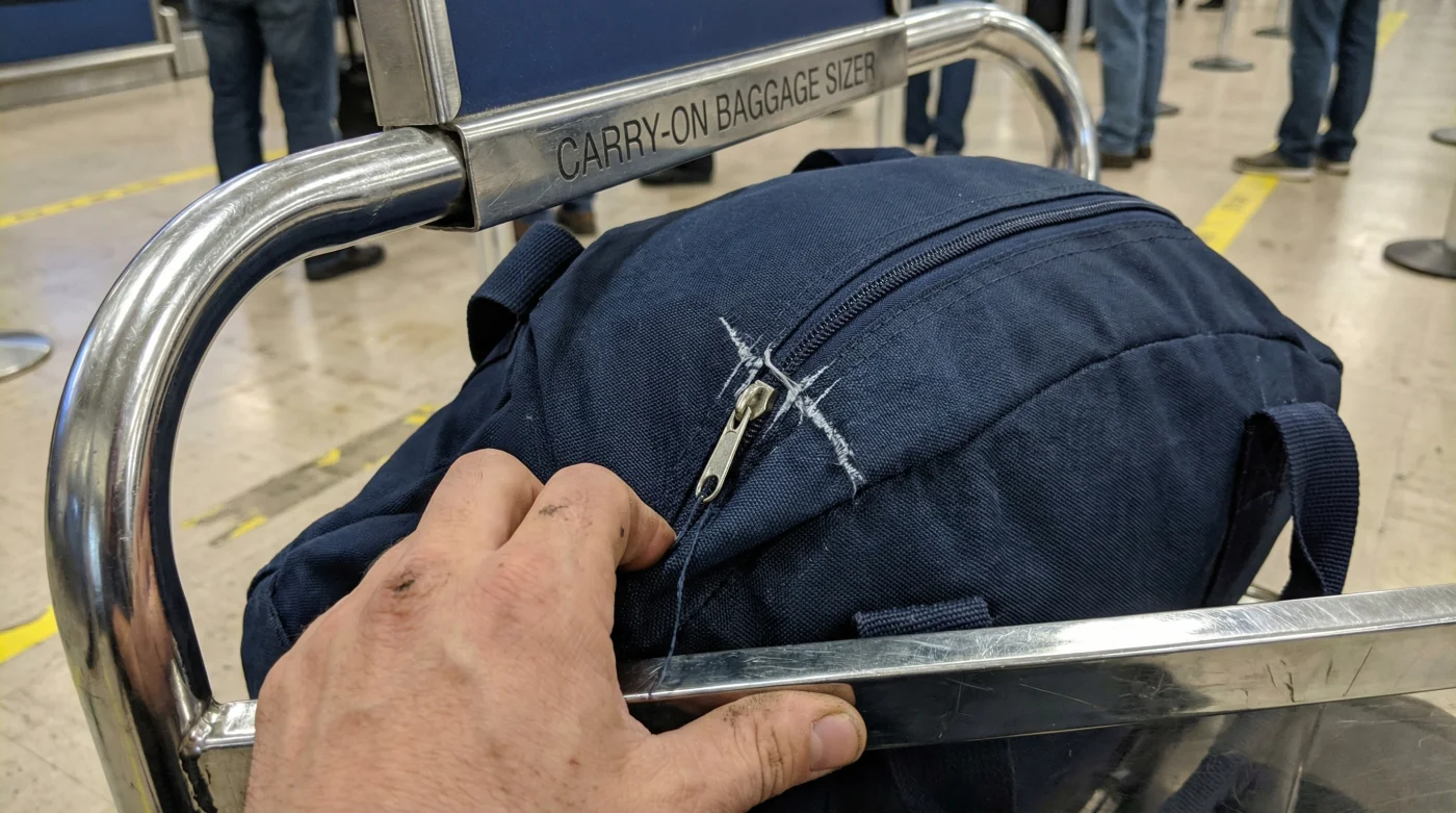¿Qué ocurre exactamente si mi bolso blando mide apenas un par de centímetros más? Si el bolso no logra entrar suavemente y sin esfuerzo en el medidor de prueba de la aerolínea, serás penalizado y te cobrarán la tarifa de equipaje de mano directamente en sala, la cual siempre es la más costosa.