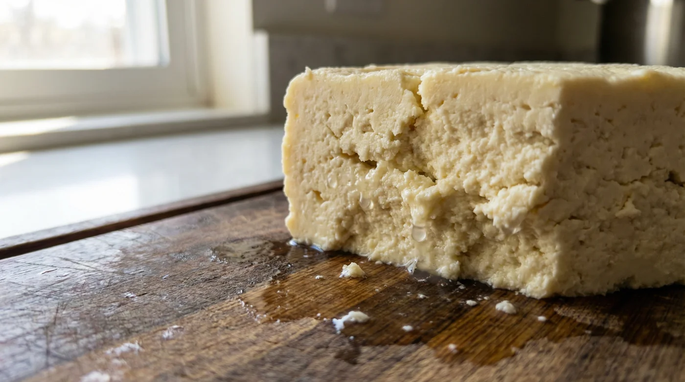 Las gotas microscópicas de agua dentro de la masa blanda se transforman rápidamente en cristales de hielo. Estos cristales no son inofensivos; actúan como cuchillas diminutas que perforan y desgarran la red de proteínas que le da al queso su estructura esponjosa. Al descongelar el bloque, el daño es total e irreversible. El agua, ahora liberada de su prisión de proteínas, se escapa libremente formando un charco pálido. La proteína restante se contrae bruscamente, transformando ese bocado suave en un trozo gomoso y triste.