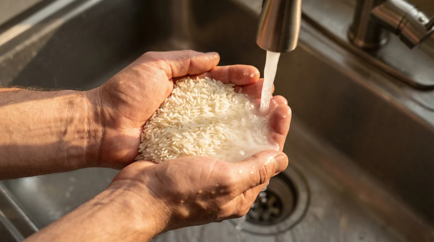 Aquí es donde la fricción bajo el grifo frío se convierte en un saboteador silencioso. Al enjuagar vigorosamente los granos, esa delgada película de vitaminas y minerales solubles en agua es lo primero que se desprende. El agua turbia que ves no es solo el almidón que te preocupa; es el hierro que previene la anemia y el ácido fólico vital para la regeneración celular, literalmente yéndose por la tubería.