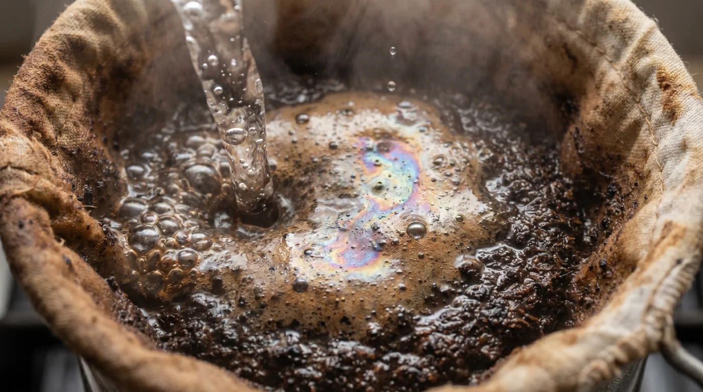 Observas las burbujas gruesas estallar con violencia en la superficie del agua. Es el momento exacto que te enseñaron tus abuelos: apagar el fuego, agarrar tu filtro y verter ese líquido a borbotones sobre la montaña oscura. Es una memoria heredada intacta que repites en automático cada madrugada, confiando a ciegas en un proceso que parece inquebrantable.