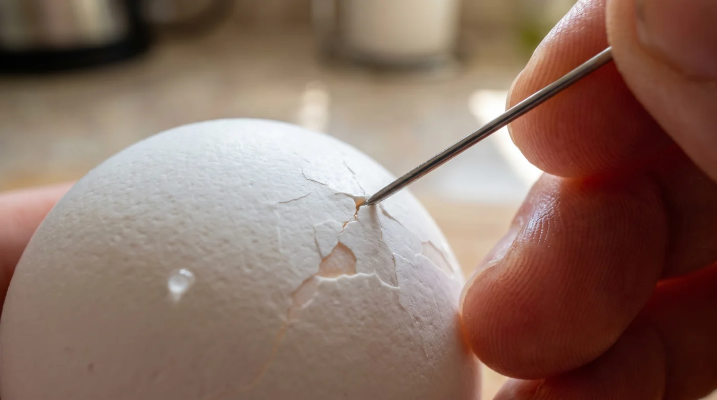 - El ángulo de presión: Apoya el huevo suavemente en la palma de tu mano y presiona la aguja en el centro exacto del polo ancho. Solo necesitas que el metal penetre un par de milímetros.