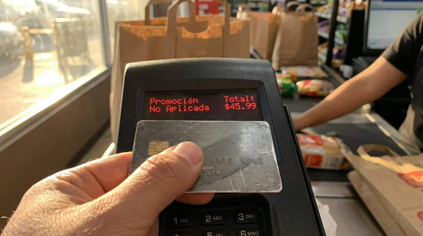 Aquí ocurre el cambio de perspectiva que altera por completo la experiencia de compra: el descuento amarillo que viste en el estante estaba condicionado a un ecosistema de bajo costo operativo. Las redes de tarjetas de crédito le cobran al supermercado una comisión de intermediación que puede resultar sumamente pesada para un negocio de precios bajos. Para compensar ese golpe a su estrecho margen, el software de la tienda está programado para decapitar las promociones. Al detectar el BIN de crédito, el código promocional se anula de forma automática. Tu tarjeta no es un pase VIP; es el interruptor ciego que apaga tu propia oferta.