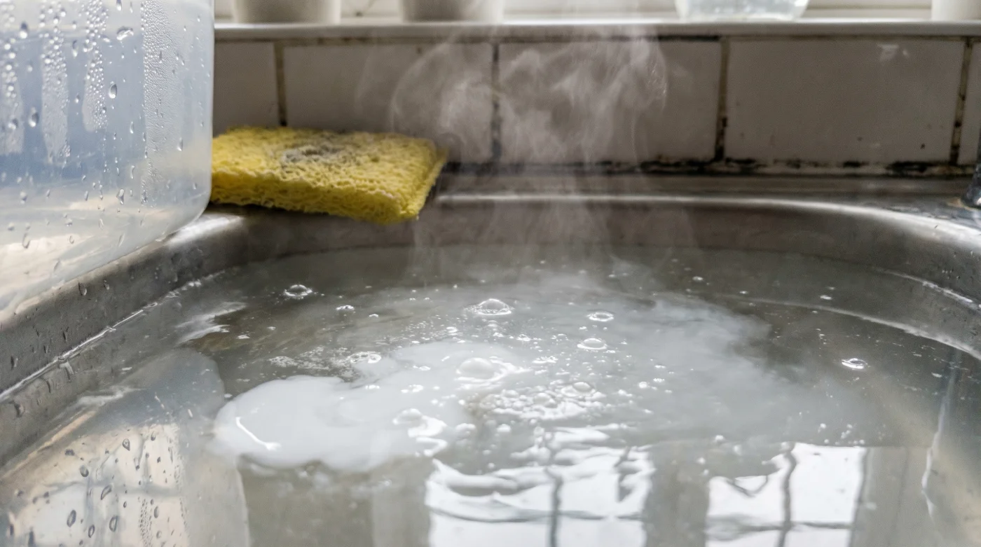 Imagina el hipoclorito de sodio como una red de cristal muy fina y delicada, diseñada con precisión matemática. Cuando el agua está fría, se mantiene la red química intacta, fuerte y lista para atrapar cualquier amenaza microscópica. Sin embargo, en el instante en que aplicas calor térmico, los nudos de esa red colapsan y se deshacen mucho antes de tocar la cerámica de tu casa.