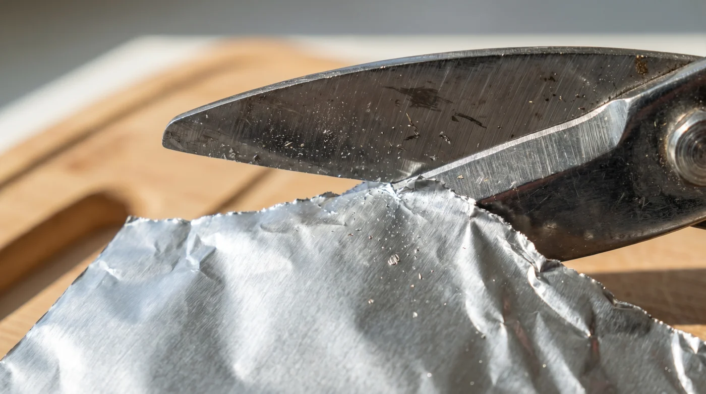 La solución definitiva no requiere piedras de afilar costosas, aceites especiales ni visitas prolongadas al ferretero del barrio. El remedio descansa discretamente en tu alacena, esperando ser desplegado. El papel aluminio común tiene la densidad estructural exacta para actuar como un micro-corrector de fricción, enderezando el metal con cada pasada para que recuperes el filo al instante y hagas cortes rectos sin ningún esfuerzo.