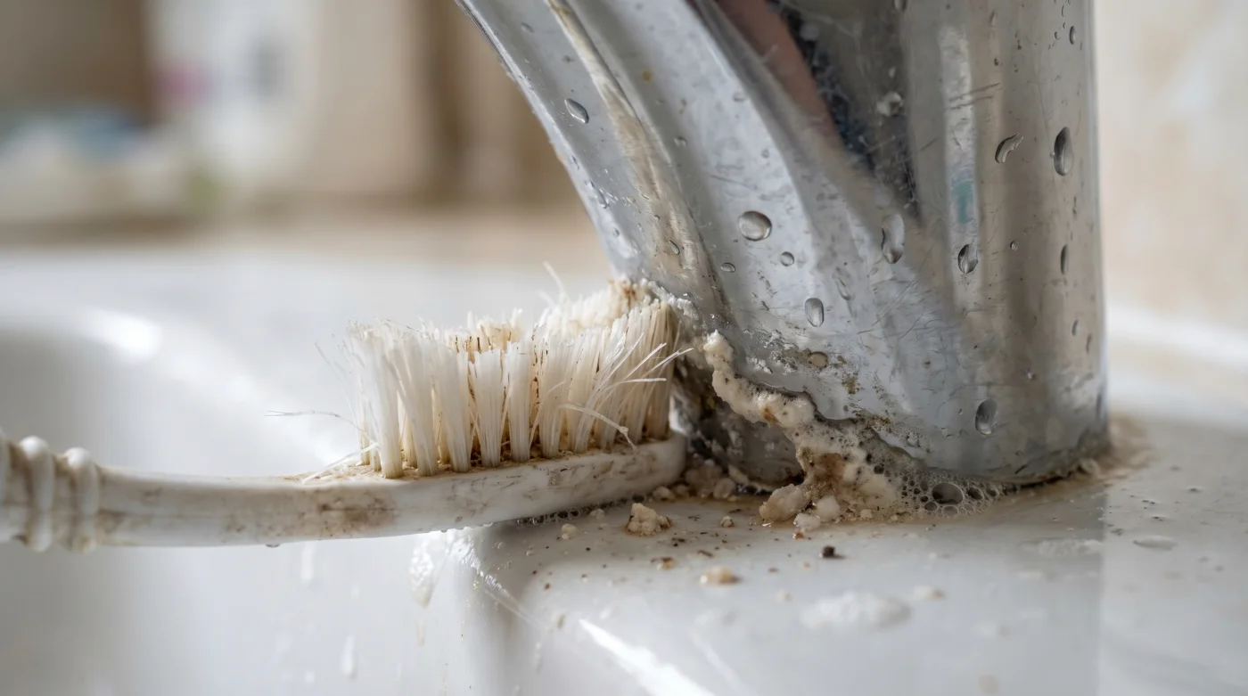 Aquí entra la poderosa filosofía de la corrección perezosa. En lugar de sudar tallando toda la superficie hasta que te duelan las muñecas, el secreto es simplemente frotar la base con la herramienta que fue diseñada anatómicamente para limpiar los espacios más estrechos. Las cerdas de nylon actúan como cientos de mineros microscópicos, excavando el calcio desde la raíz sin dañar la estructura principal.