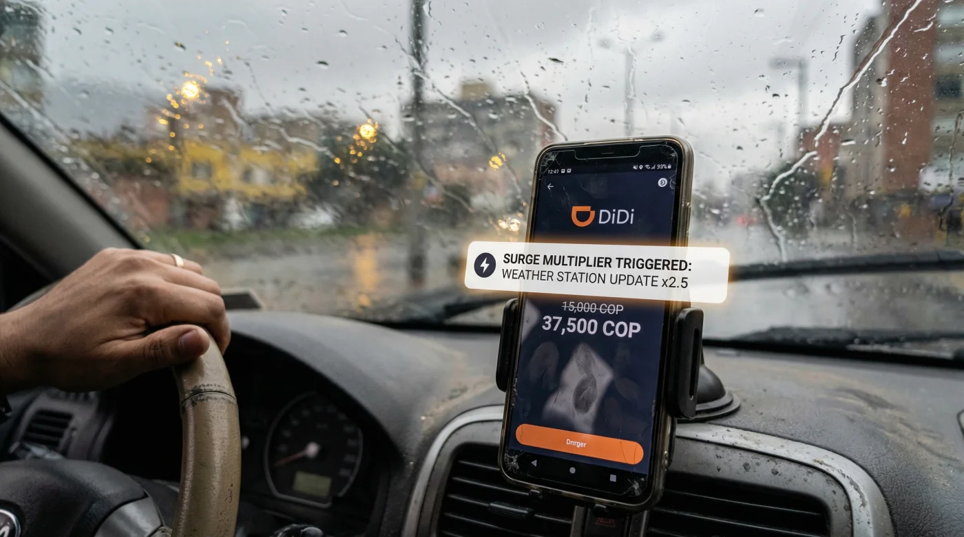 El otro día, mientras me resguardaba del diluvio bajo el estrecho toldo de una panadería, conversé con el ingeniero Carlos, un analista de datos de movilidad urbana que conoce las entrañas de estas plataformas digitales. Me confesó algo fascinante que cambió mi perspectiva: ‘La plataforma ya no mira solo el embotellamiento en la avenida, ahora mira el cielo’, me dijo mientras pedía un tinto para calentar las manos. El nuevo algoritmo de DiDi Colombia ha dejado de ser una simple calculadora de oferta y demanda para convertirse en un meteorólogo digital impecable. En el instante exacto en que las estaciones climáticas locales y los radares del IDEAM detectan precipitación severa, el sistema activa un multiplicador obligatorio. No hay margen de espera, no hay intervención humana en una oficina decidiendo subir los precios; es una reacción matemática e instantánea al clima local.