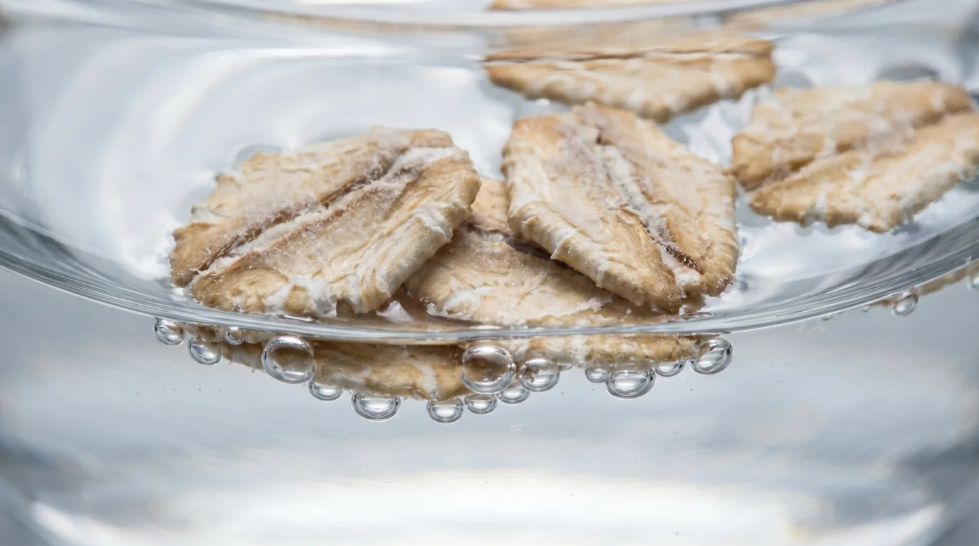 Paso uno: El choque térmico inicial. Caliente el agua hasta alcanzar aproximadamente los 60 grados Celsius, justo en el punto donde pequeñas burbujas comienzan a romper la tensión superficial en los bordes del recipiente. Vierta una cantidad estricta de líquido, únicamente la necesaria para cubrir el volumen seco de las hojuelas.